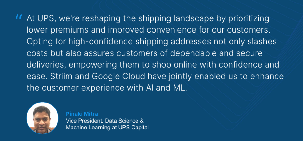UPS Capital integrated Striim’s real-time data streaming technology with Google BigQuery’s analytics capabilities to enhance delivery security. Striim enabled immediate data ingestion from various sources, facilitating real-time risk assessments and proactive decision-making. The data flowed seamlessly into Google BigQuery, where advanced analytics and machine learning predicted delivery risks and optimized logistics strategies. The innovative DeliveryDefenseTM Address Confidence system utilized this data to assign confidence scores to delivery locations, improving predictive accuracy and allowing businesses to manage delivery risks effectively.