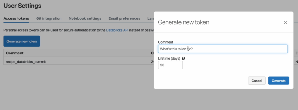 - Next, we can go ahead and generate a Personal access token that will be used to authenticate the user’s access to Databricks