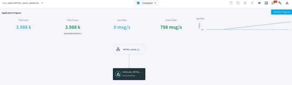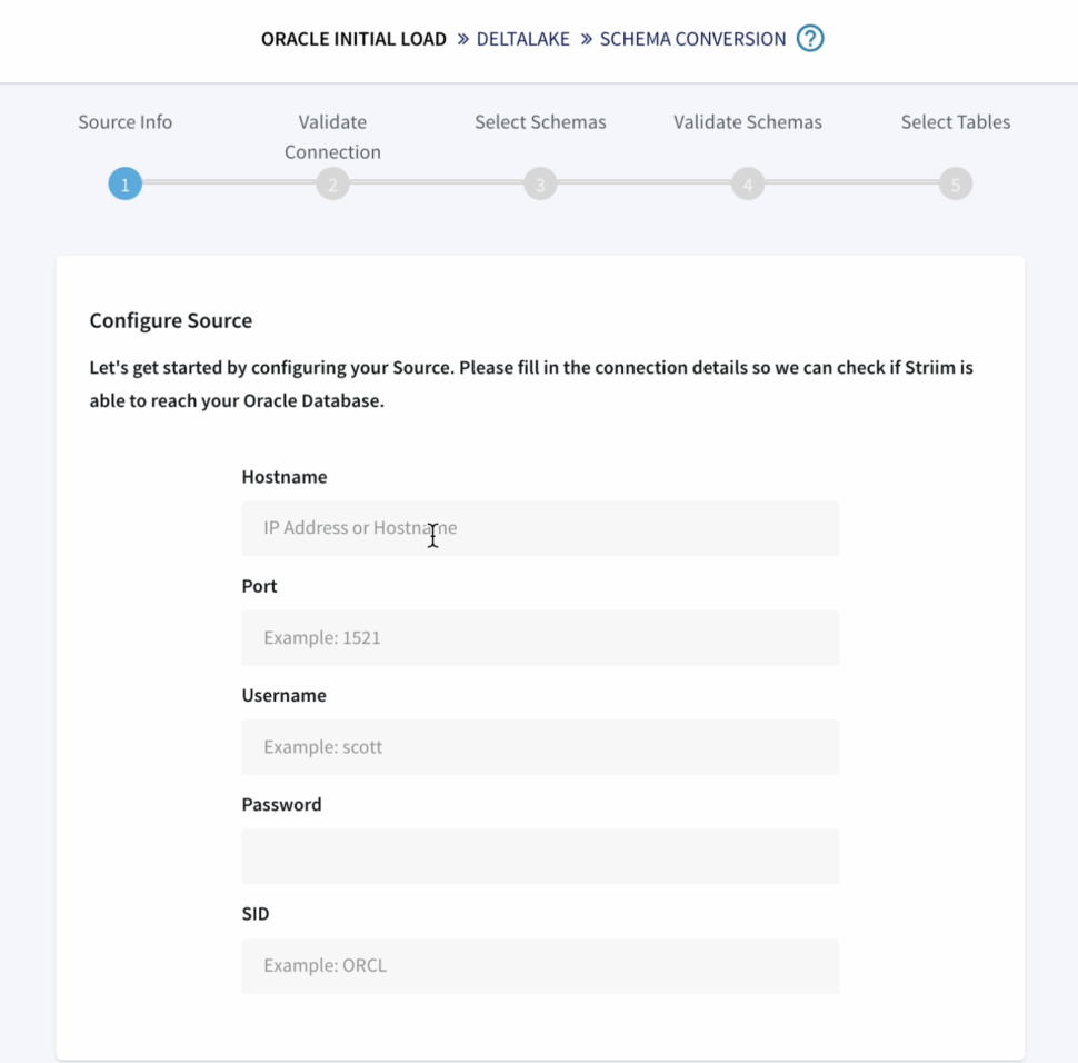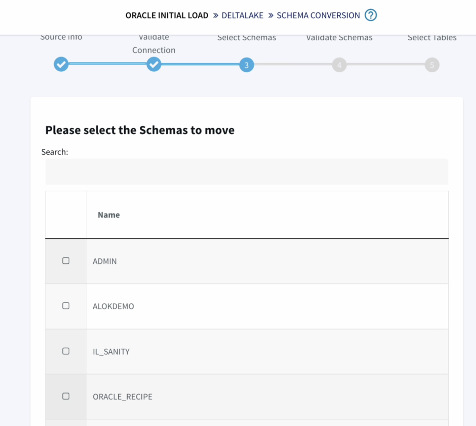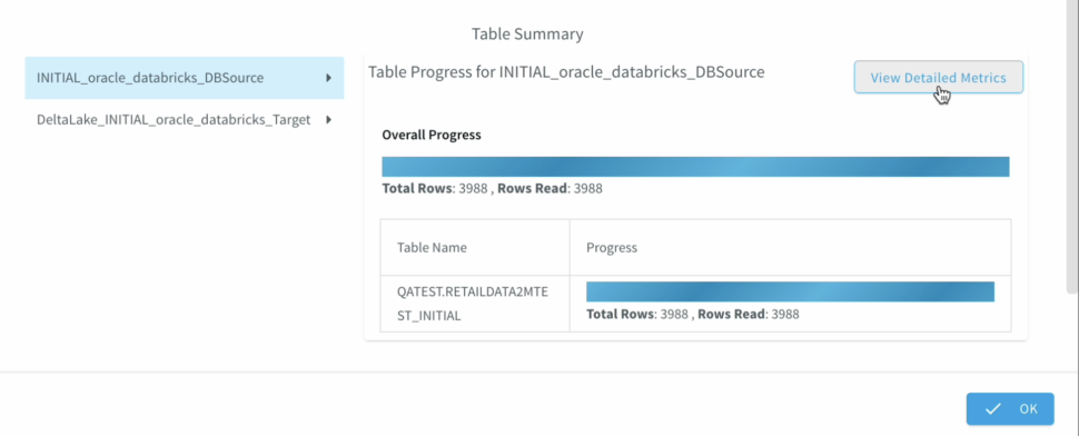 The wizard takes care of validating the target connections, using the oracle metadata to create schema in the target and initiate the historical data push to delta lake as well.