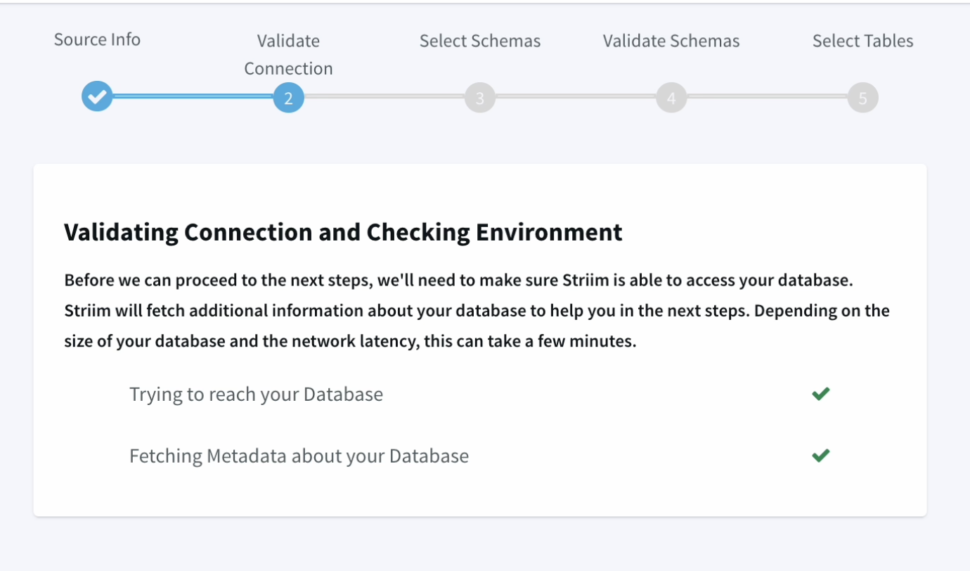 Striim offers the ability to reduce the amount of time and manual effort when it comes to setting up these connections and also creates the schema at the target with the help of a simple wizard.