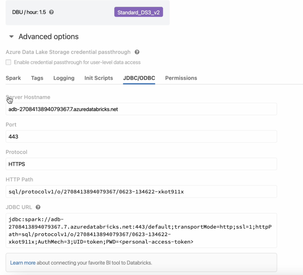 - Under the advanced settings, select the JDBC/ODBC settings to view the cluster’s Hostname and JDBC URL.